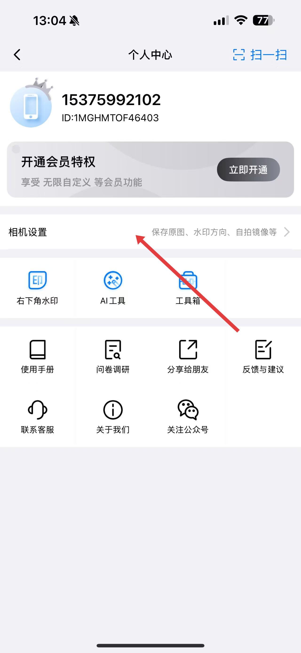 2、在個人中心里,點(diǎn)擊相機(jī)設(shè)置右側(cè)保存原圖、水印方向、自拍鏡像等文字區(qū)域,進(jìn)入相機(jī)設(shè)置界面。