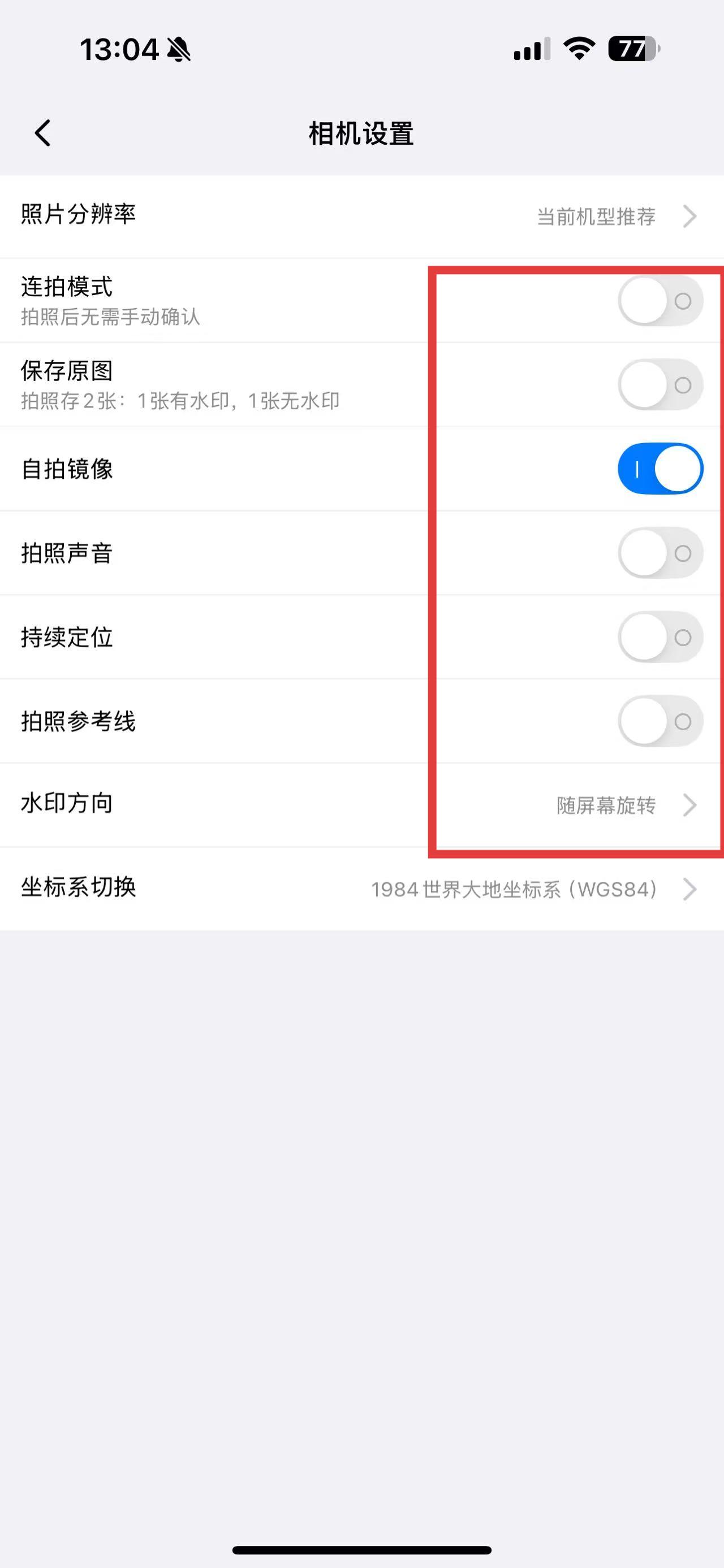 4、在相機(jī)設(shè)置界面,能對連拍模式、保存原圖、自拍鏡像、拍照聲音、持續(xù)定位、拍照參考線、水印方向等進(jìn)行設(shè)置,按需開啟或調(diào)整。