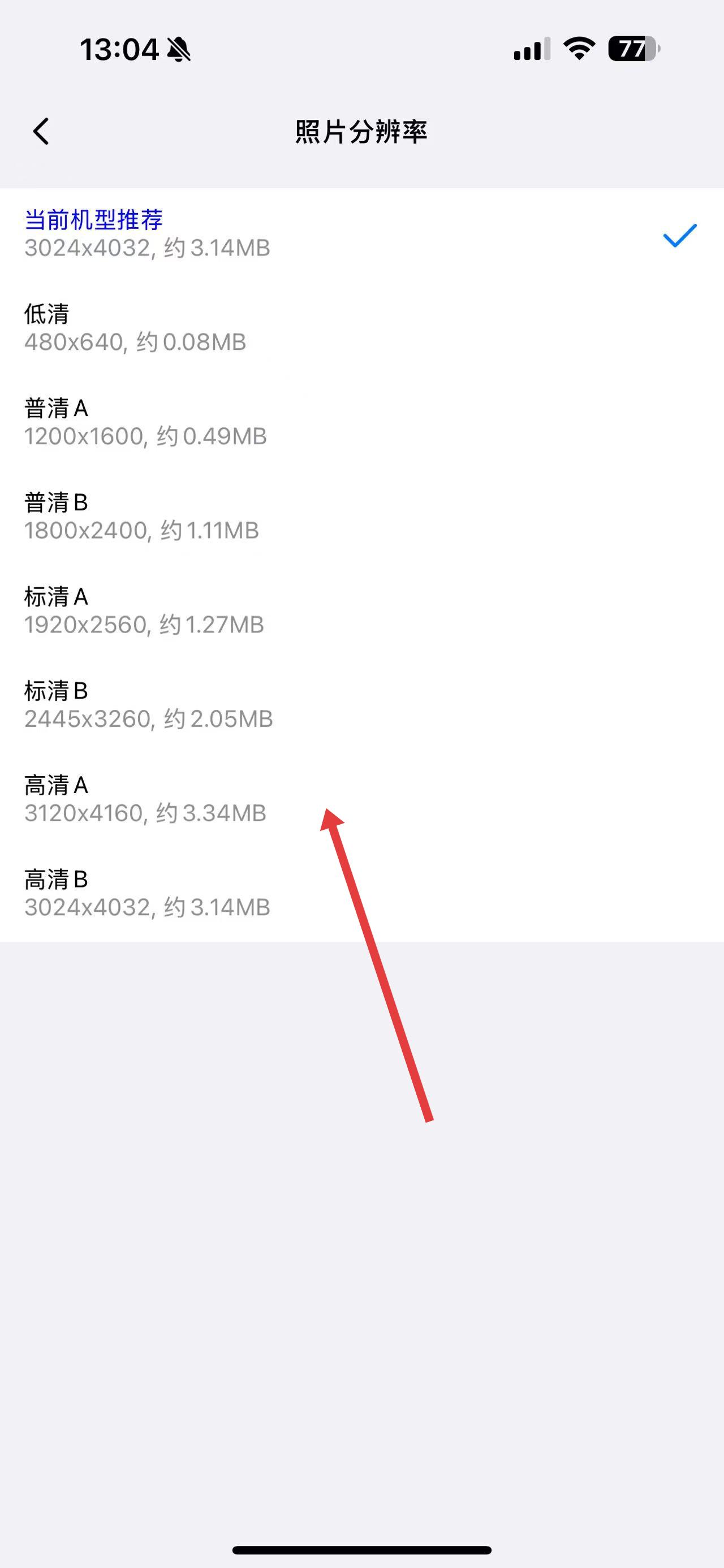 3、在相機(jī)設(shè)置界面中,點(diǎn)擊照片分辨率選項,從列表里可選擇如高清A等所需分辨率。