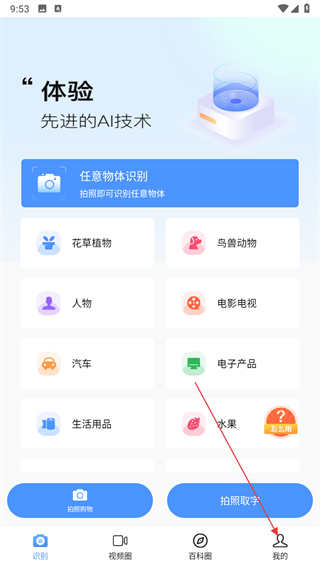 1、打開百科掃描王應(yīng)用,點(diǎn)擊界面右下角的我的,進(jìn)入個(gè)人頁面。
