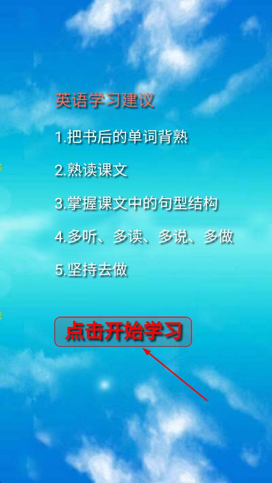 2、在英語(yǔ)學(xué)習(xí)建議頁(yè)面,點(diǎn)擊“點(diǎn)擊開(kāi)始學(xué)習(xí)”,進(jìn)入學(xué)習(xí)內(nèi)容選擇頁(yè)面。