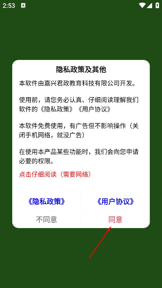 1、打開(kāi)語(yǔ)文英語(yǔ)學(xué)習(xí)軟件,彈出“隱私政策及其他”提示彈窗,閱讀相關(guān)內(nèi)容后,點(diǎn)擊“同意”,進(jìn)入英語(yǔ)學(xué)習(xí)建議頁(yè)面。