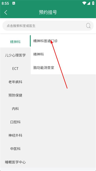 2、在預(yù)約掛號(hào)頁(yè)面選擇科室,如精神科普通門診。