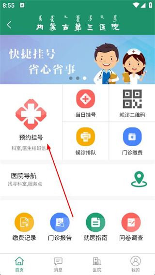 1、打開(kāi)內(nèi)蒙古第三醫(yī)院APP,在首頁(yè)點(diǎn)擊預(yù)約掛號(hào)。