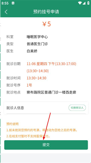 6、在預(yù)約掛號(hào)申請(qǐng)頁(yè)面,確認(rèn)信息無(wú)誤后,點(diǎn)擊提交。
