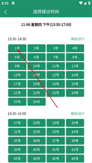 5、在選擇候診時(shí)間頁(yè)面,選擇具體的就診號(hào)序。