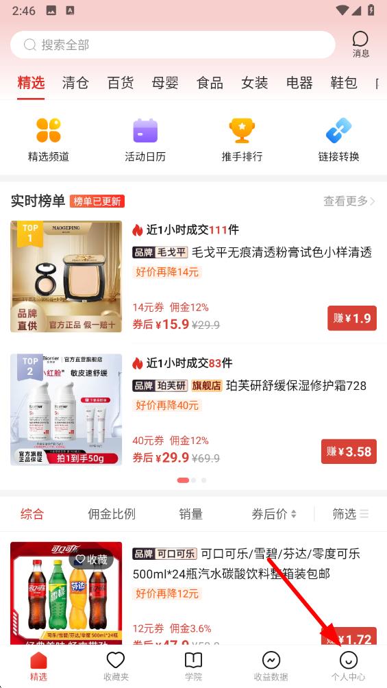 1、打開多多進(jìn)寶app,進(jìn)入首頁后點擊底部導(dǎo)航欄中的個人中心選項,進(jìn)入個人中心界面。