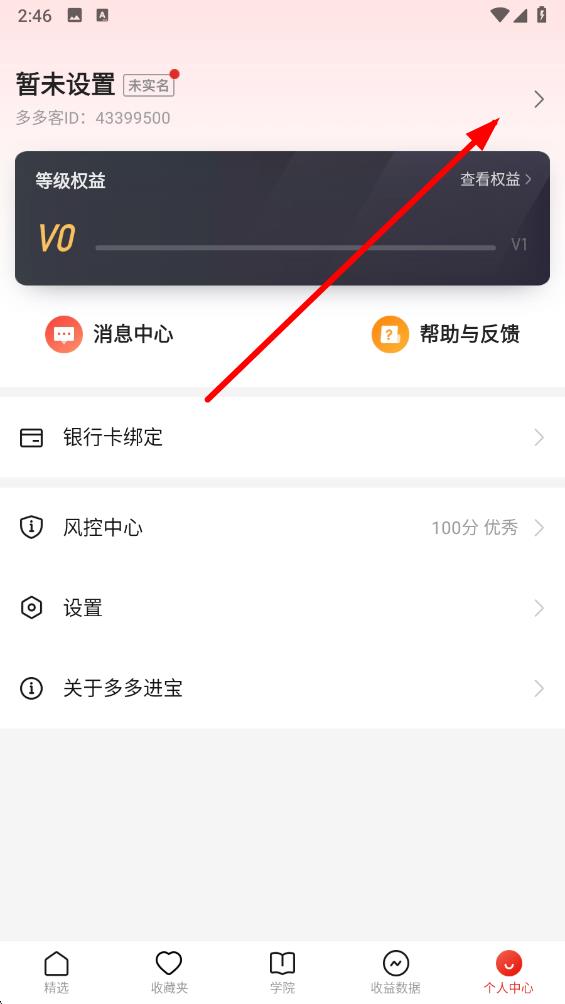 2、在個人中心界面,頂部點擊頭像右側(cè)箭頭,進(jìn)入賬戶信息頁面。
