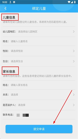 3、填寫兒童信息和家長信息,點(diǎn)擊提交申請,完成兒童綁定。
