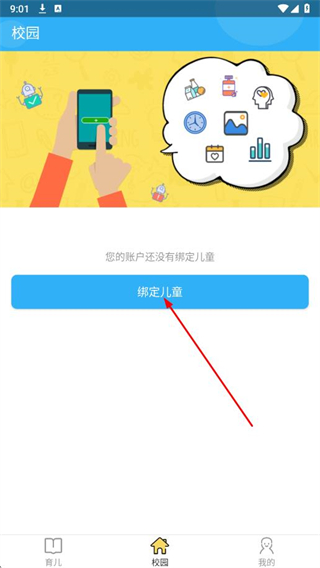 1、打開孩子國APP,在校園頁面點(diǎn)擊綁定兒童。
