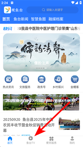 1、打開(kāi)魚(yú)臺(tái)融媒app,點(diǎn)擊底部魚(yú)臺(tái)TV,進(jìn)入魚(yú)臺(tái)TV頁(yè)面。