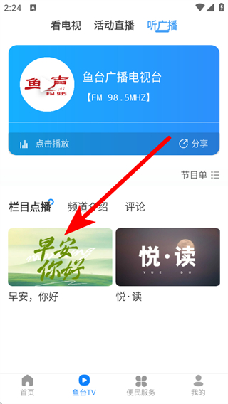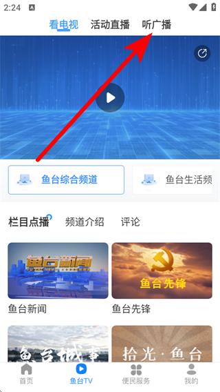 2、在魚(yú)臺(tái)TV的頁(yè)面,需要點(diǎn)擊聽(tīng)廣播按鈕,進(jìn)入廣播板塊。