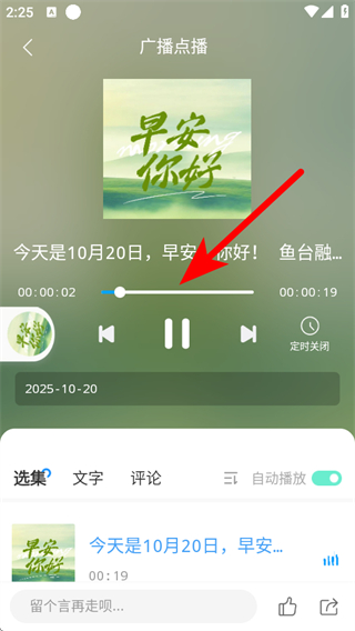 4、在廣播點(diǎn)播頁(yè)面,可通過(guò)進(jìn)度條調(diào)節(jié)播放進(jìn)度,或設(shè)置定時(shí)關(guān)閉等。