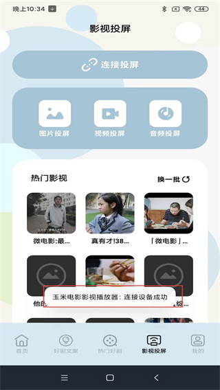 1、啟動玉米電影APP,進入首頁點擊下方影視投屏的圖標(biāo)。