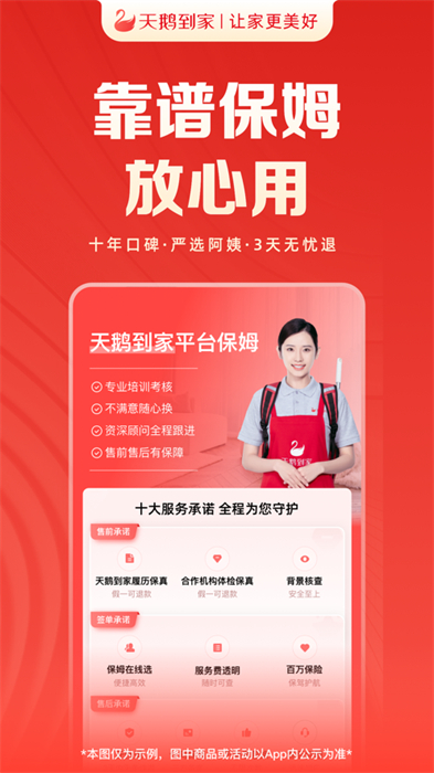 安全保障 隨時響應(yīng):天鵝到家為每一位用戶提供高額保險,保障人身財產(chǎn)安全。300人專業(yè)客服團(tuán)隊,快速響應(yīng)您的反饋與需求。