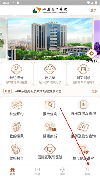 1、打開(kāi)江蘇省中醫(yī)院APP,點(diǎn)擊導(dǎo)航欄中的我的。