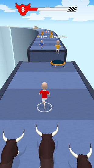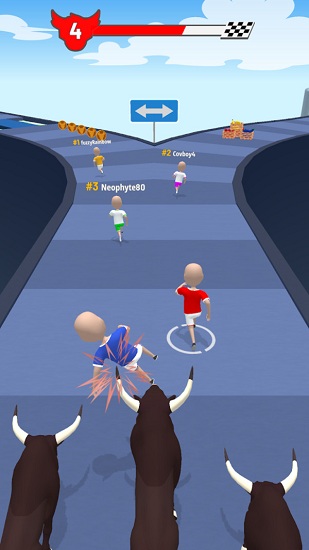 穿著鮮艷的衣服惹惱了公牛,只會大喊著公牛別過來,有什么用呢,牛又聽不懂人話,正確的方法當然是撒開腳丫子趕緊跑啊,在賽道上還要注意見機行事,相信只要自己的速度夠快,就不會被牛逮住一頓蹂躪。只要順利擺脫牛,就能獲得一次喘息的機會哦,趕緊下載體驗。