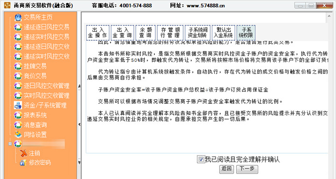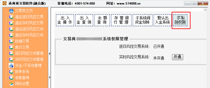 交易商開通子系統(tǒng)交易權(quán)限,首先需要安裝“甬商所交易軟件融合版”,在“子系統(tǒng)權(quán)限”模塊中,開通相關(guān)交易權(quán)限。具體操作如下(以開通實時風(fēng)控權(quán)限為例):