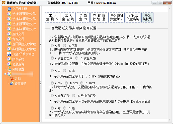 7、交易密碼驗證正確后,進入“實時風(fēng)控測試”界面,在這里,需要交易商把測試題全部回答正確,才能開通“實時風(fēng)控交易權(quán)限”。