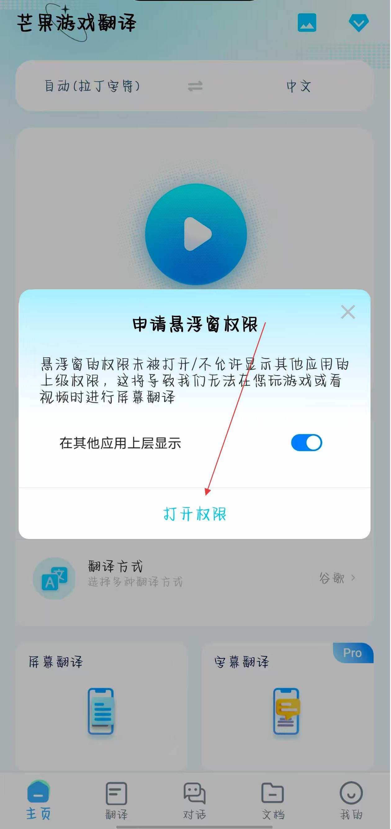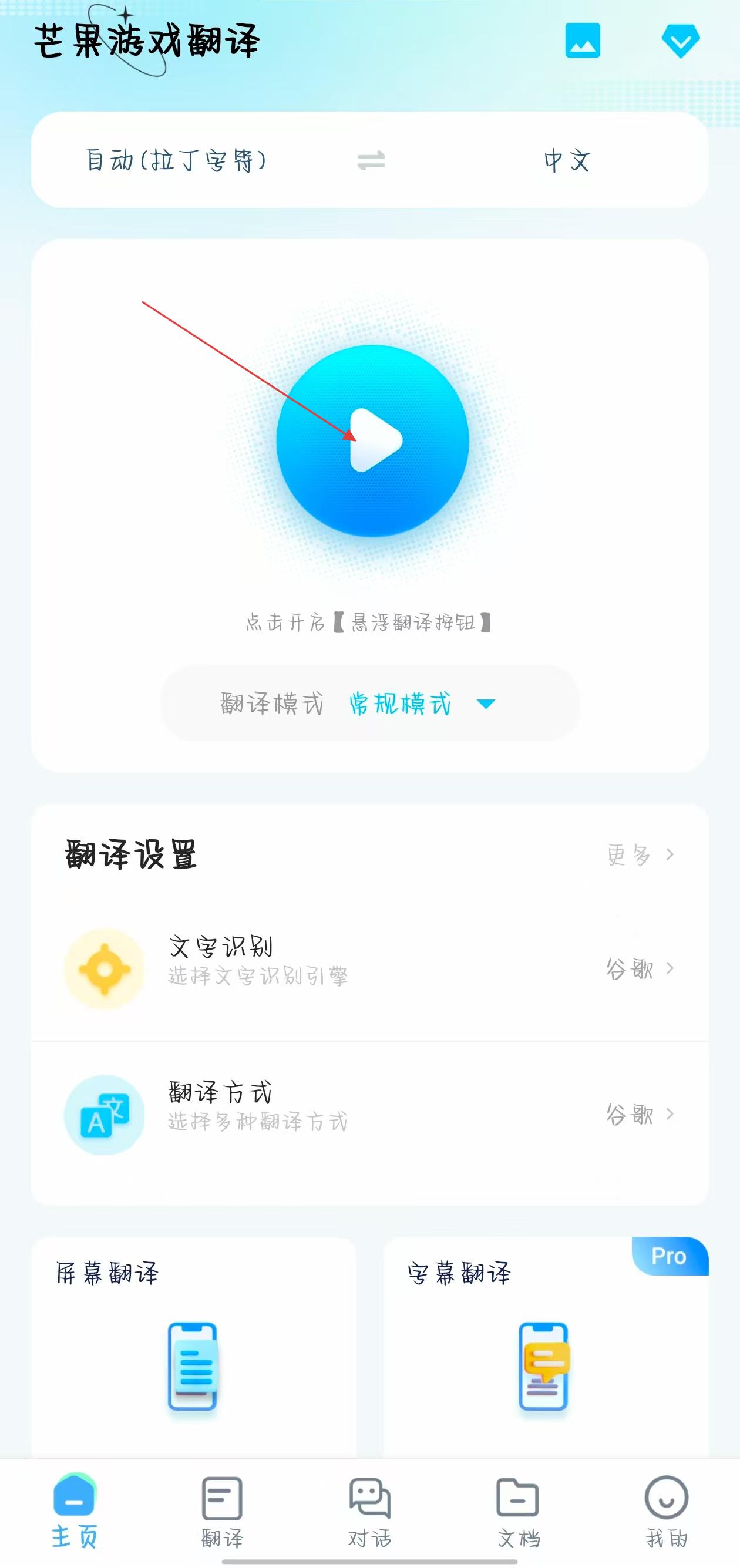1、打開芒果游戲翻譯應(yīng)用,點(diǎn)擊首頁中用于開啟懸浮翻譯的按鈕。