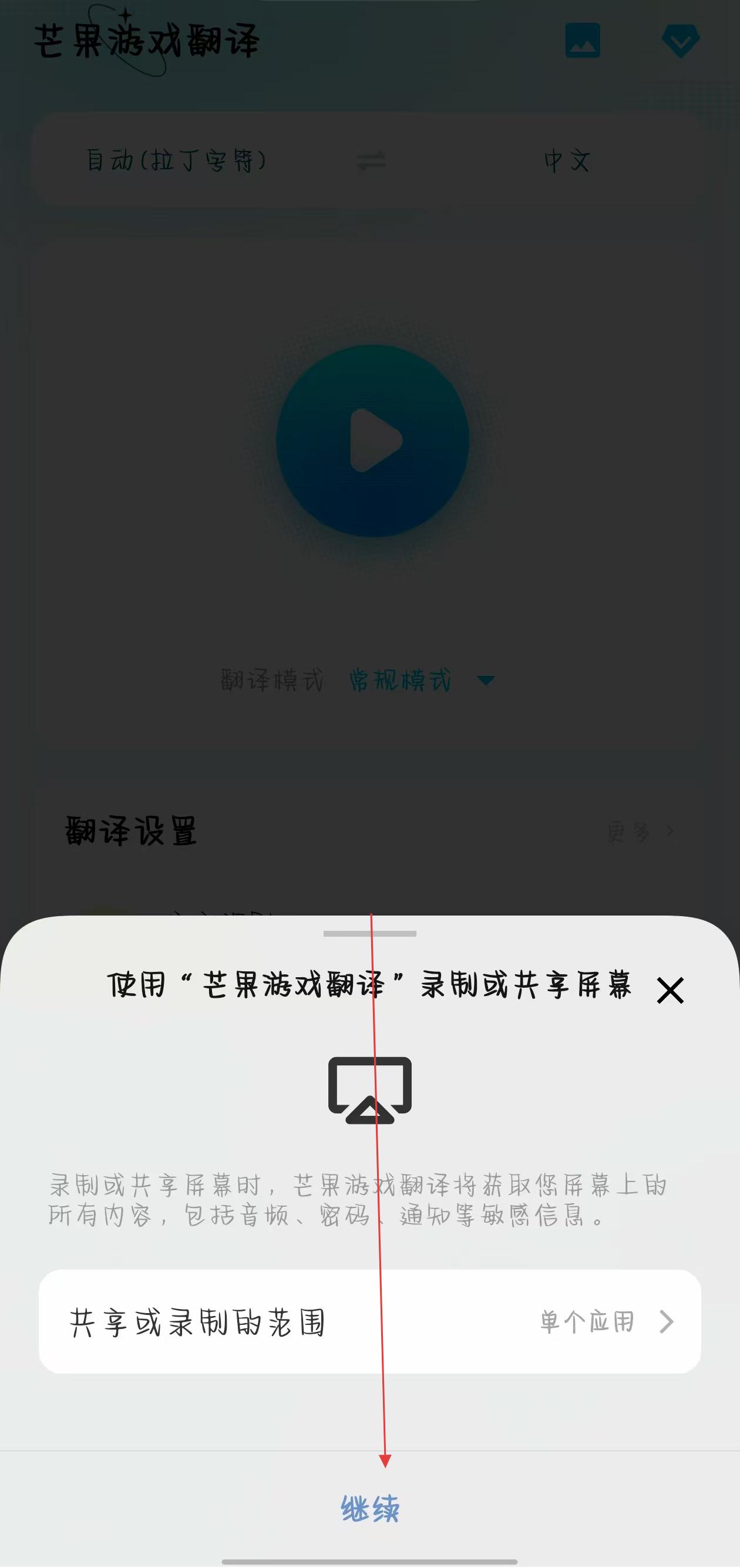 3、開啟后會出現(xiàn)使用芒果游戲翻譯錄制或共享屏幕的提示,點(diǎn)擊該提示下方的繼續(xù)按鈕。