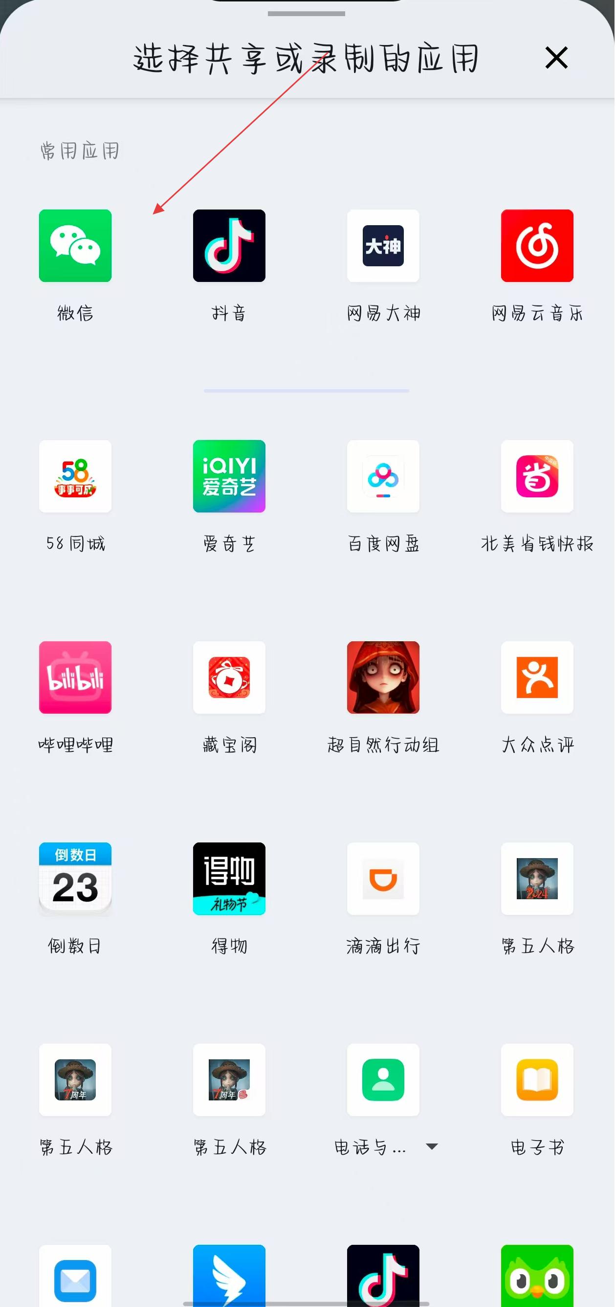 4、在選擇共享或錄制的應(yīng)用列表里,選擇需要進(jìn)行翻譯的目標(biāo)應(yīng)用,完成權(quán)限設(shè)置后,屏幕上會顯示懸浮球。