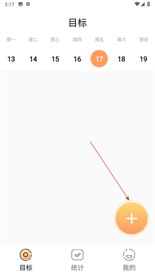 1、打開(kāi)打卡時(shí)間規(guī)劃APP,進(jìn)入目標(biāo)頁(yè)面,點(diǎn)擊右下角橙色加號(hào)按鈕,進(jìn)入新建目標(biāo)界面。
