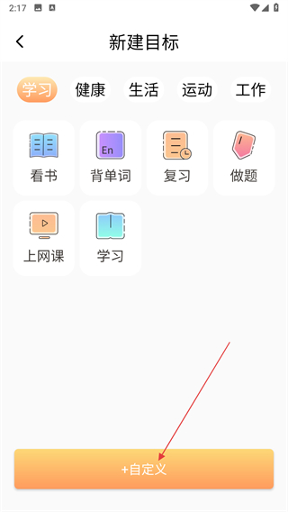 2、在新建目標(biāo)界面,點(diǎn)擊底部+自定義按鈕,進(jìn)入自定義目標(biāo)設(shè)置頁(yè)面。