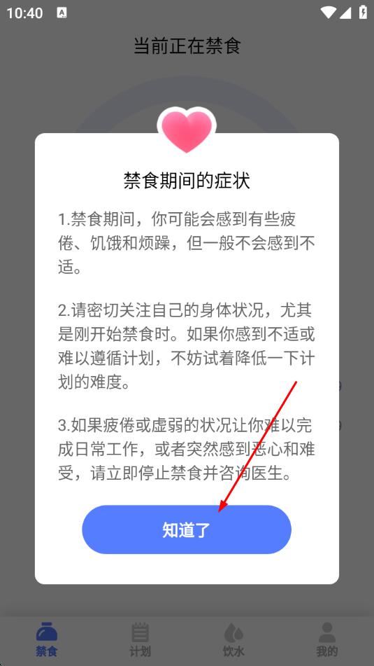 4、彈出關(guān)于禁食期間癥狀的提示彈窗,閱讀了解相關(guān)信息后,點擊知道了。