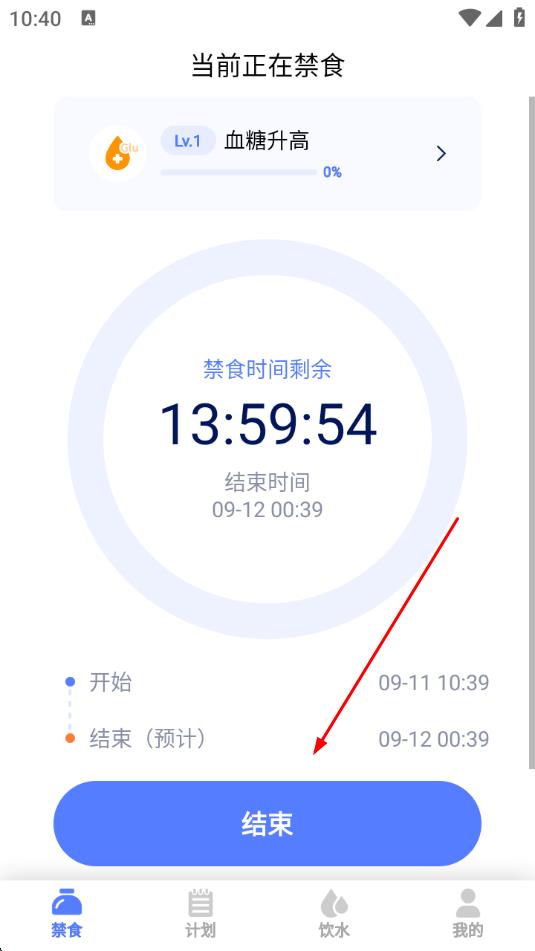 3、進入禁食計時頁面,可看到禁食剩余時間和預(yù)計結(jié)束時間,如果想提前結(jié)束禁食,點擊結(jié)束按鈕。
