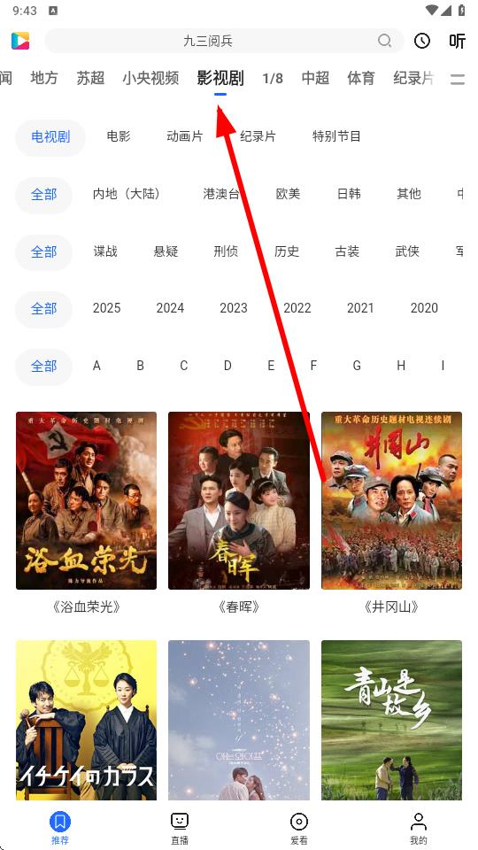 2、在推薦頁面上方的導航欄中,滑動找到并點擊影視劇標簽,進入影視劇分類界面。
