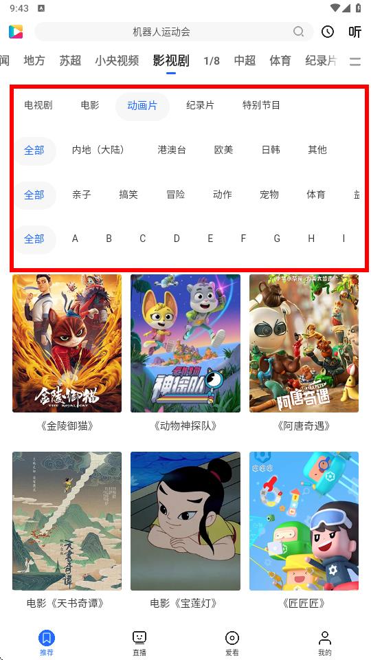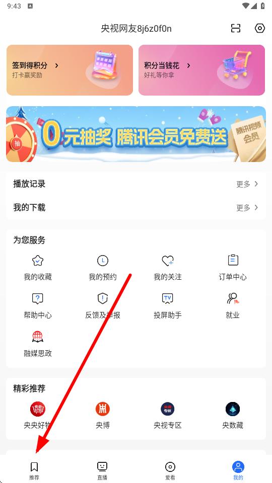 1、打開央視影音應用,點擊底部導航欄中的推薦選項,進入推薦頁面。