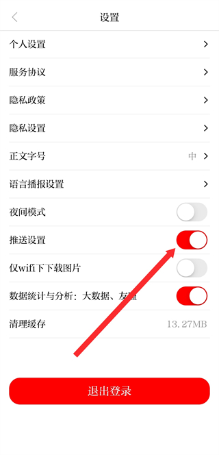 3、在設置頁面找到推送設置,點擊開關關閉,即可關閉推送消息。