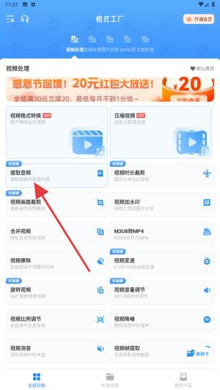 1、打開格式工廠APP,在首頁內(nèi)點(diǎn)擊提取音頻的按鈕。