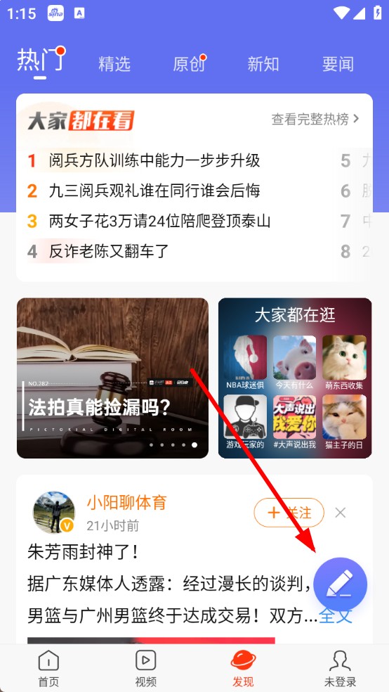 2、在“發(fā)現(xiàn)”頁面,點擊右下角藍(lán)色鉛筆圖標(biāo),進(jìn)入發(fā)布動態(tài)界面。