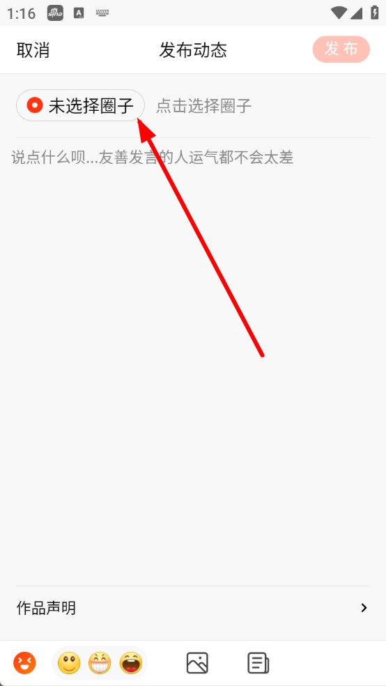 3、在發(fā)布動態(tài)界面,點擊未選擇圈子,按需選擇要發(fā)布到的圈子,也可跳過不選。
