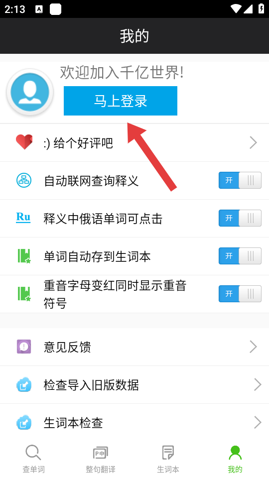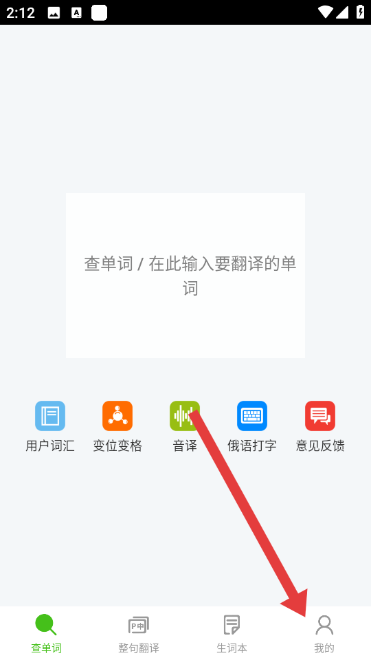 1、打開千億詞霸俄語詞典APP,點擊主界面右下角的我的選項,進入個人中心頁面。