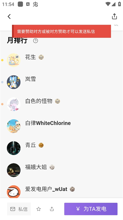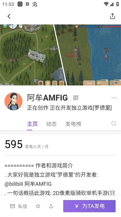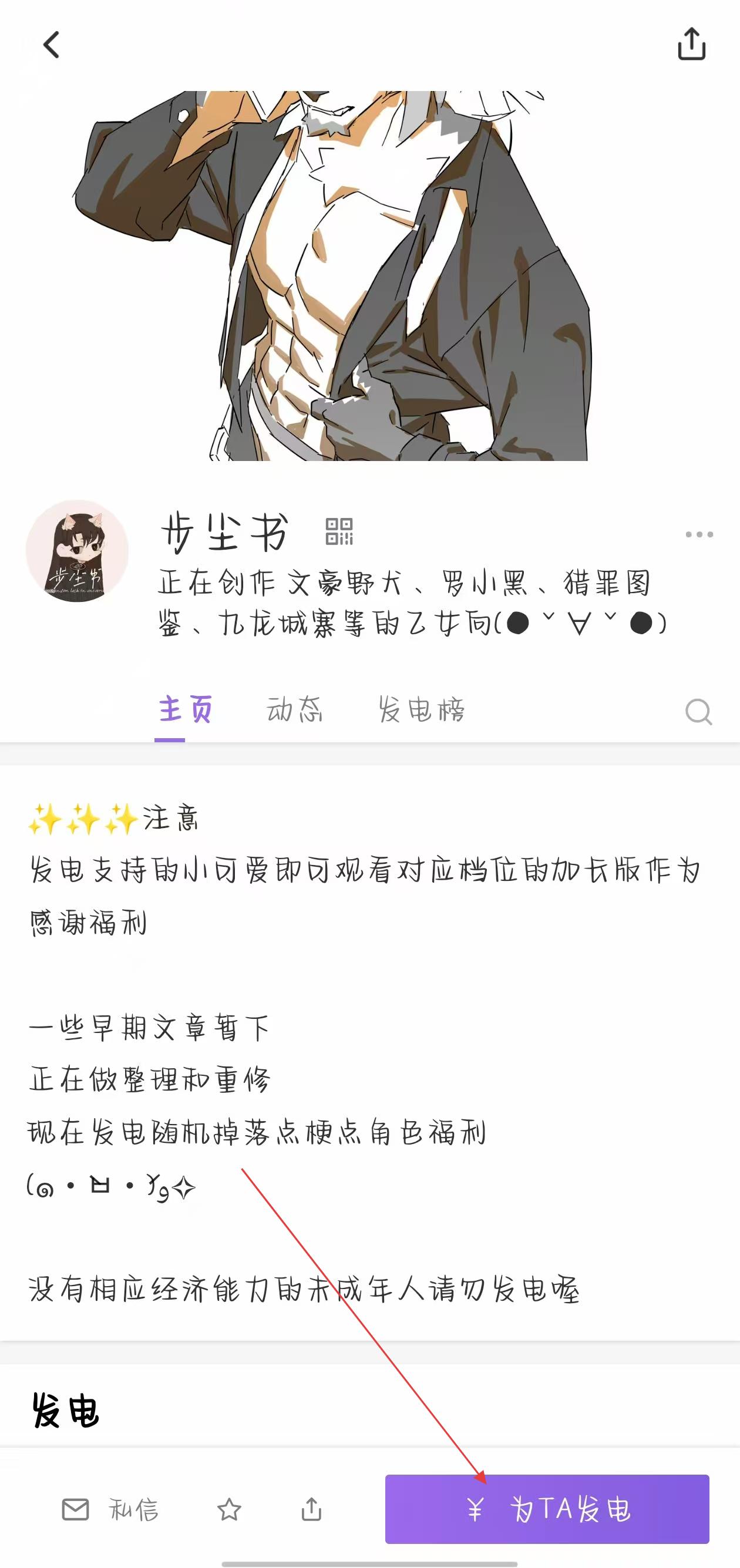 2、點(diǎn)擊目標(biāo)創(chuàng)作者的條目,進(jìn)入其主頁,可查看創(chuàng)作者的創(chuàng)作說明、動(dòng)態(tài)等信息,了解發(fā)電檔位及對應(yīng)福利。