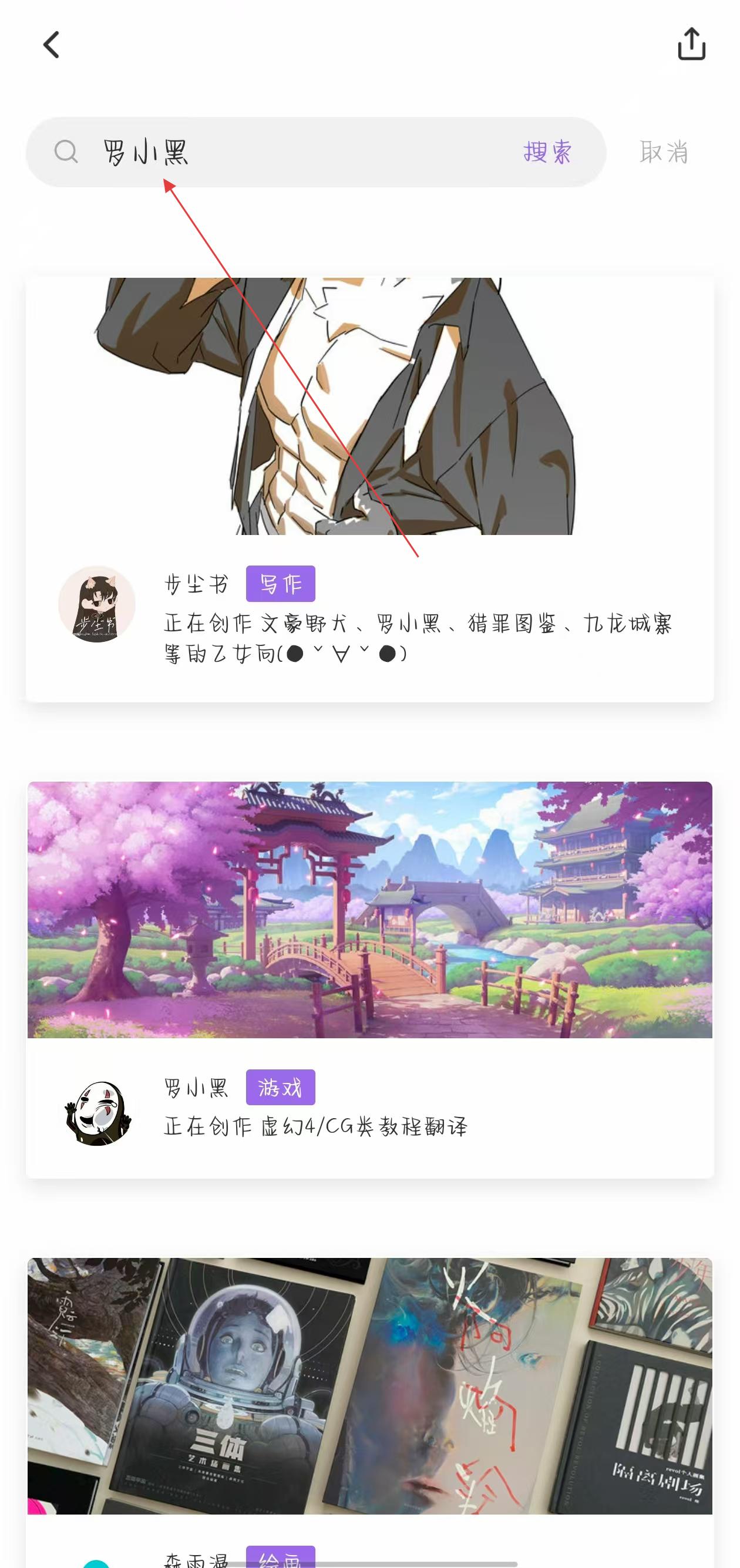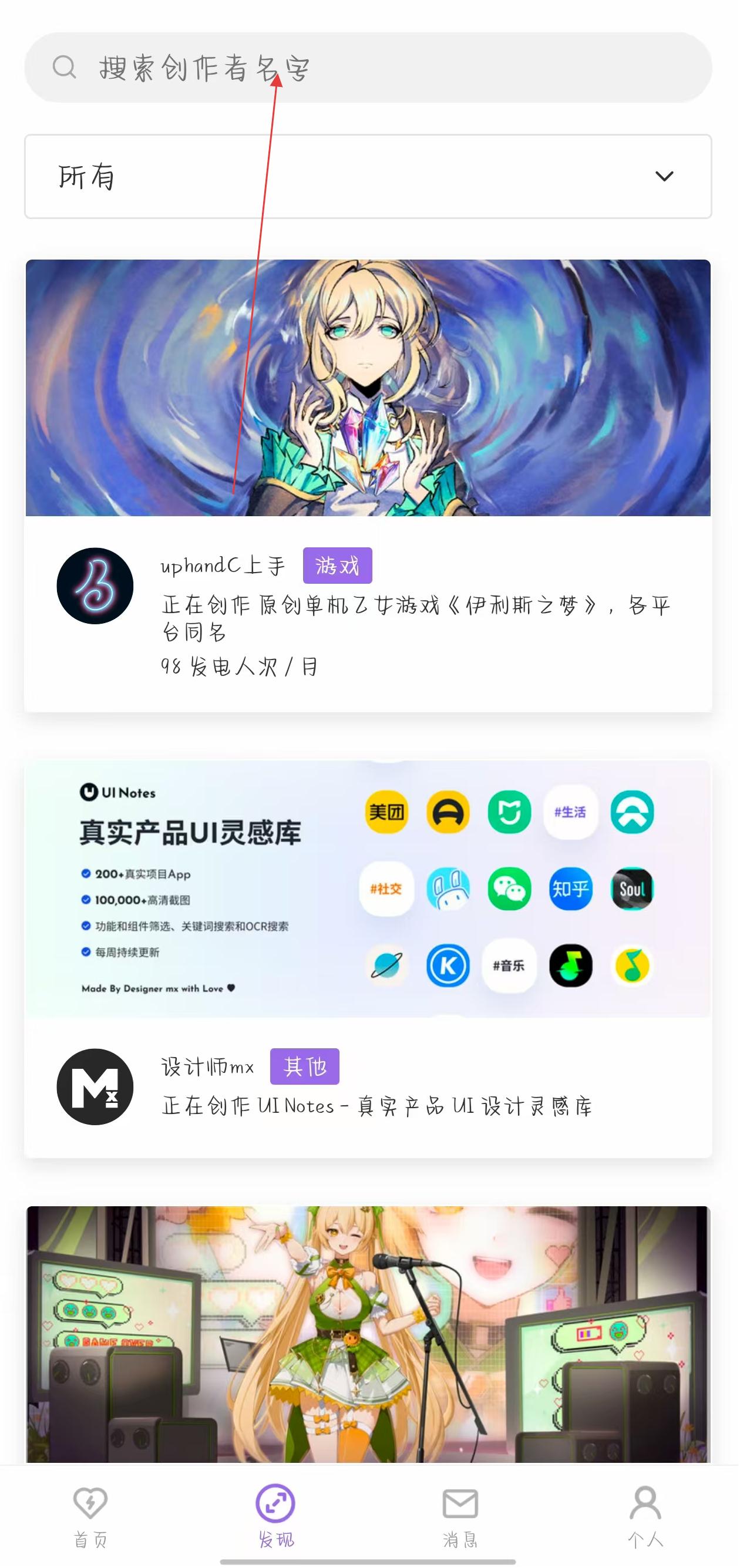 1、打開愛發(fā)電應(yīng)用,在發(fā)現(xiàn)頁面點(diǎn)擊頂部搜索欄,輸入創(chuàng)作者名字,觸發(fā)搜索后瀏覽結(jié)果列表,找到目標(biāo)創(chuàng)作者。