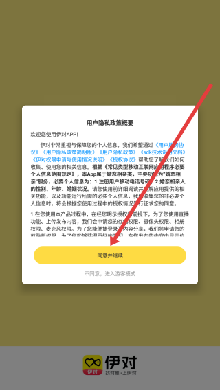 1、在打開(kāi)伊對(duì)app后,點(diǎn)擊彈窗中的同意并繼續(xù)按鈕后,進(jìn)入app使用。