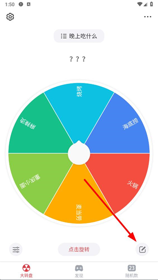 1、打開隨機大轉(zhuǎn)盤app,進入轉(zhuǎn)盤界面,點擊想要刪除選項對應(yīng)轉(zhuǎn)盤右下角的編輯圖標(biāo),進入新建轉(zhuǎn)盤頁面。