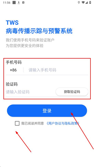 3、輸入手機號碼和驗證碼,勾選協(xié)議與政策,點擊登錄完成注冊。