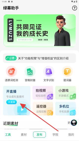 1、打開綠幕助手APP,點(diǎn)擊主頁內(nèi)開直播的功能按鈕。