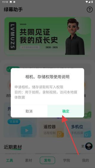 2、點(diǎn)擊后,會彈出相機(jī)、存儲權(quán)限使用說明,可點(diǎn)擊確定的按鈕。