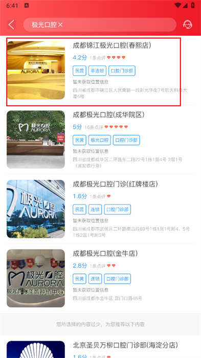 3、搜索之后屏幕上 將會出現(xiàn)相關(guān)的口腔醫(yī)院,點(diǎn)擊你想要找到的那一個(gè)醫(yī)院即可;