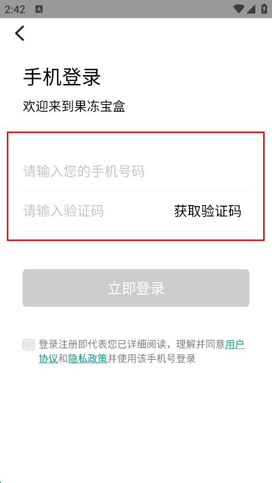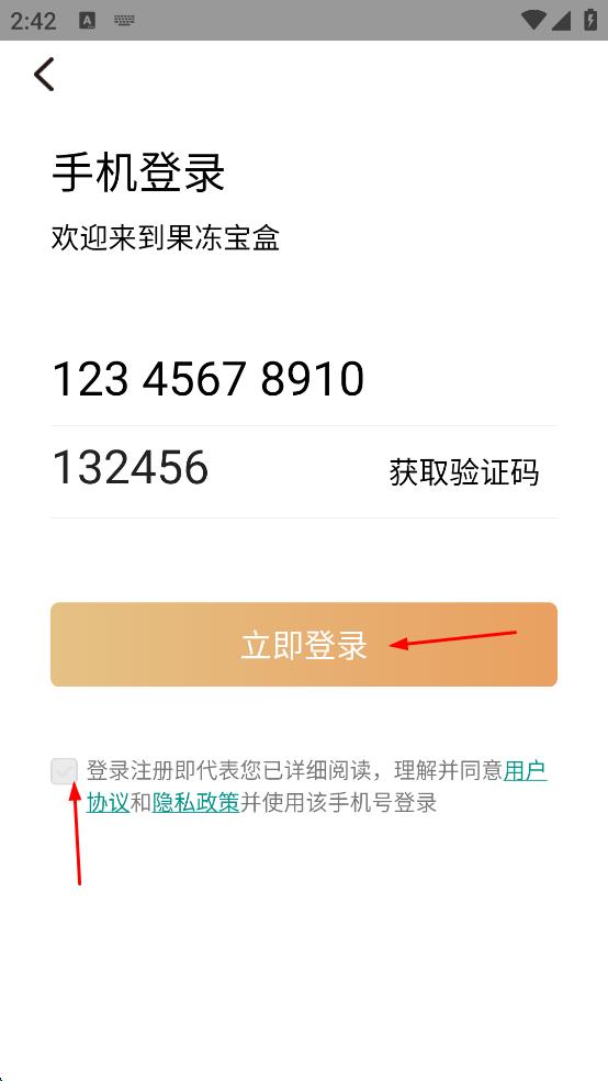 4、確認(rèn)手機(jī)號(hào)碼和驗(yàn)證碼輸入無(wú)誤,且勾選登錄注冊(cè)即代表已詳細(xì)閱讀、理解并同意用戶協(xié)議和隱私政策后,點(diǎn)擊立即登錄按鈕,即可完成果凍寶盒APP的登錄操作。