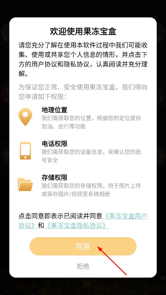 1、打開果凍寶盒APP,會(huì)彈出權(quán)限申請(qǐng)頁(yè)面,仔細(xì)閱讀相關(guān)內(nèi)容后,點(diǎn)擊同意按鈕,進(jìn)入到登錄選擇頁(yè)面。