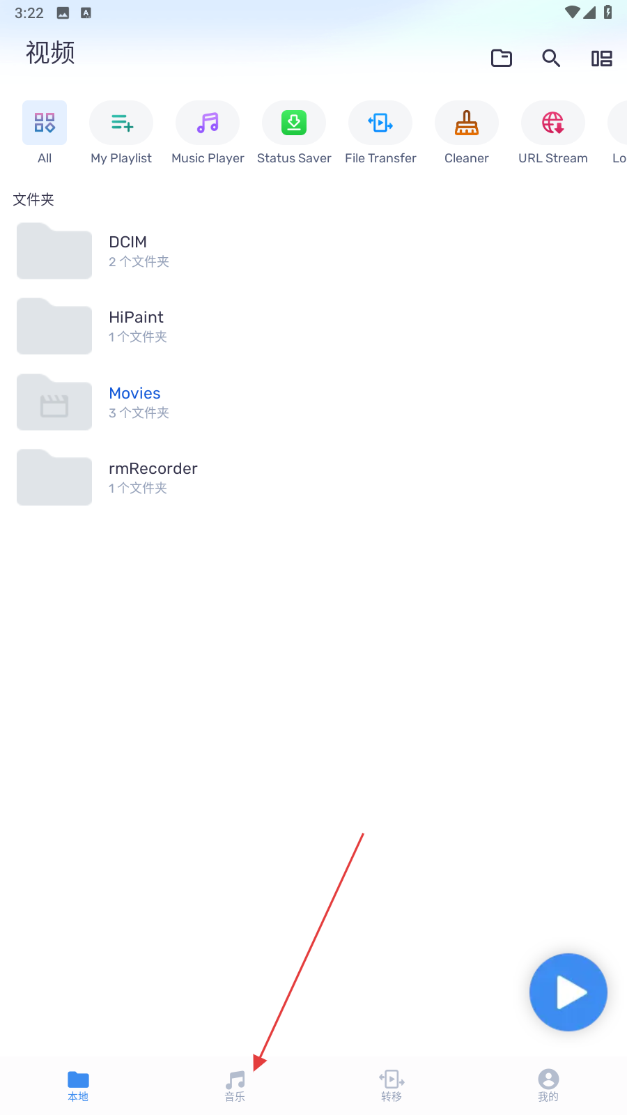 1、打開mx播放器APP,在首頁下方點擊音樂的圖標。