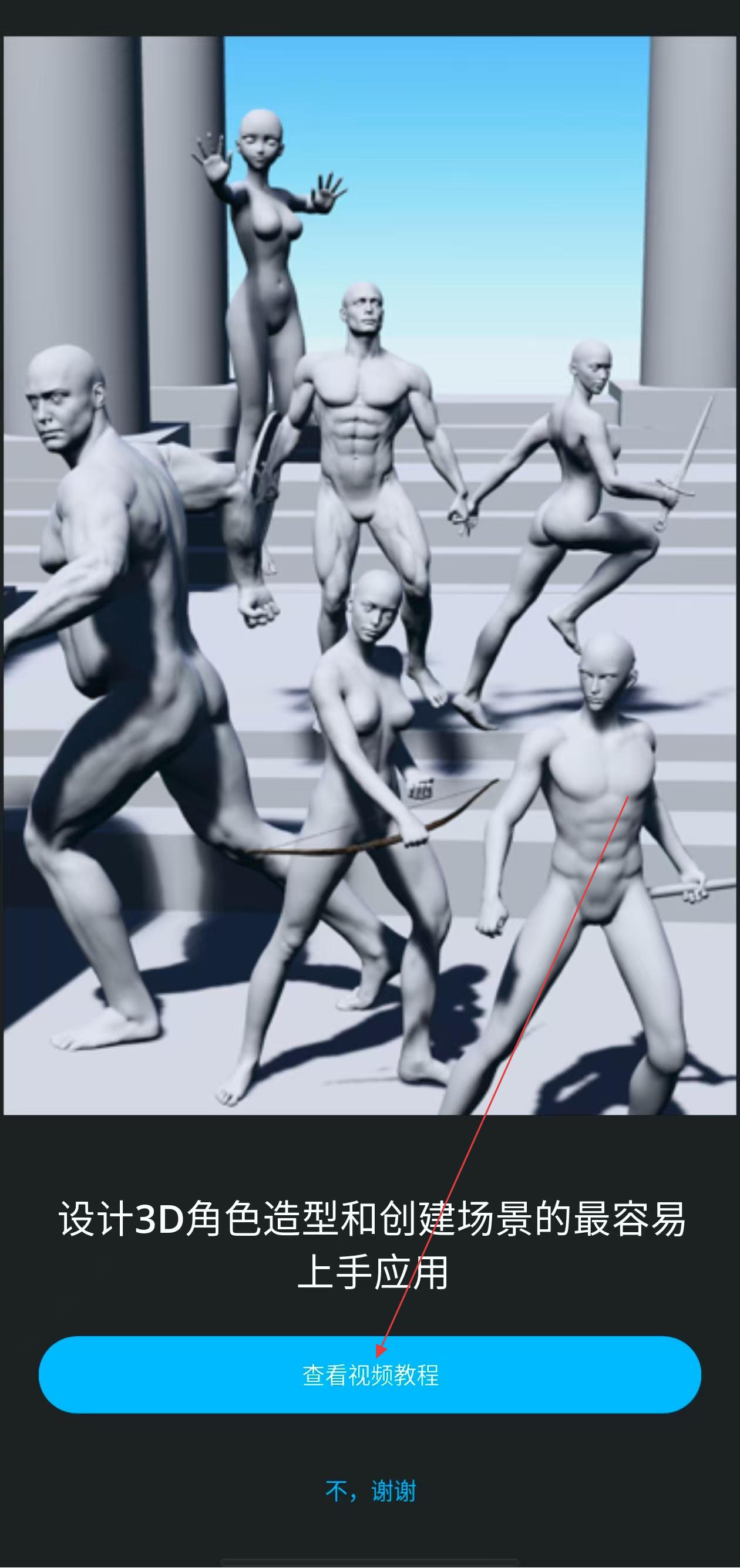3、點擊我是新用戶后,進入引導(dǎo)界面,下方有查看視頻教程按鈕,點擊它即可觀看視頻教程,了解如何設(shè)計3D角色造型和創(chuàng)建場景等操作。