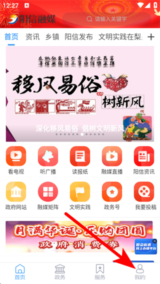1、在陽信融媒首頁,點擊底部我的按鈕,進入個人的頁面。